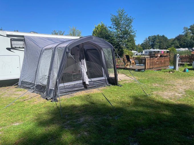 The awning stand is damaged on one side
