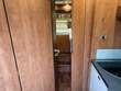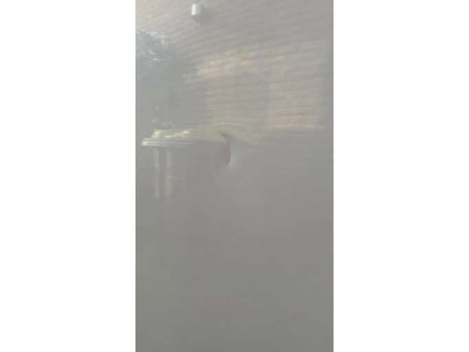 Slight dent without paint damage, outside of entrance door to living area due to impact with heater chimney.