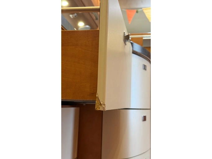 Corner of a drawer in the kitchen area chipped.