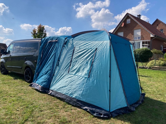Rear tent one pole broken; pop-up roof foil minimally damaged at the locking mechanism (approx. 1-2mm)