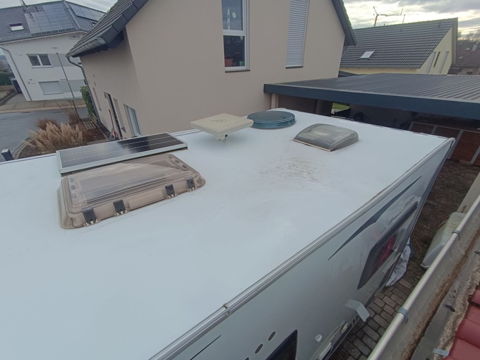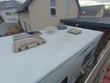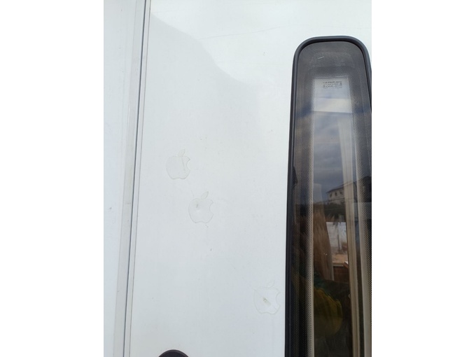 Motorhome body door with small dents. Paint defect (stone chip) front bumper. Grazing damage to alcove, shower tray cracked